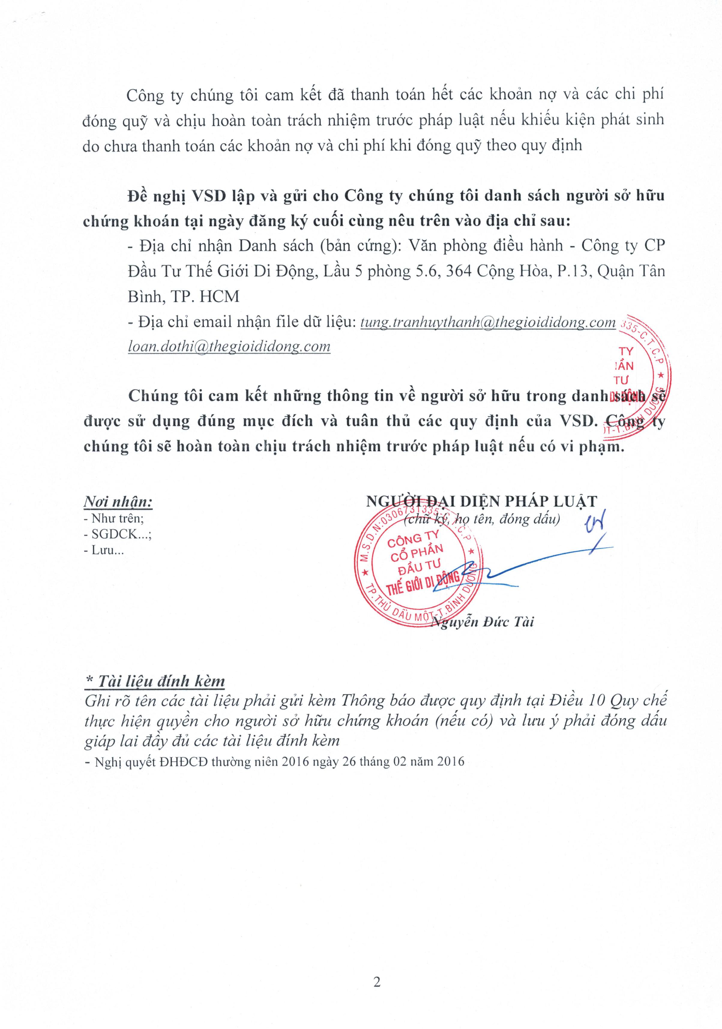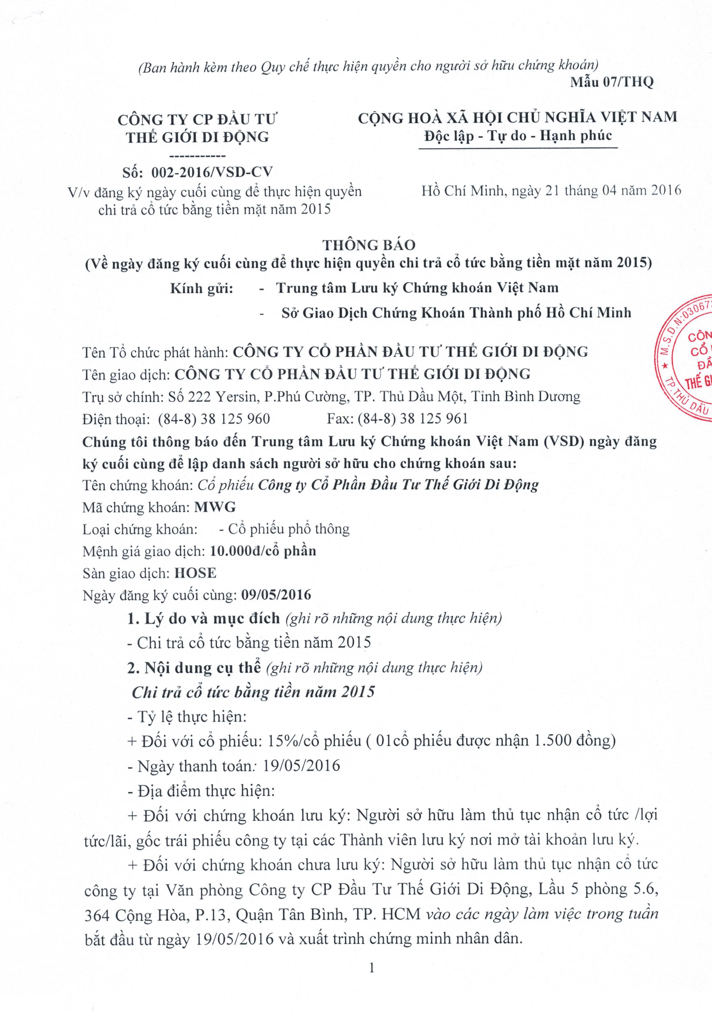 MWG xin trân trọng thông báo về Ngày đăng ký cuối cùng để thực hiện quyền chi trả cổ tức bằng tiền mặt năm 2015