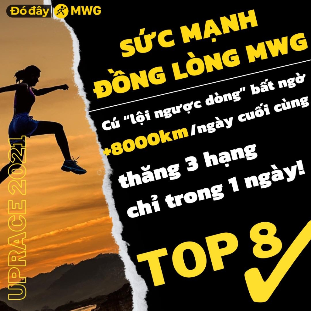 Tại mùa giải thứ 3 của UpRace, kéo dài trong suốt 22 ngày - từ ngày 31/10 đến 21/11/2021, tập thể MWG đã tham gia vô cùng tích cực, nhiệt tình với tinh thần nâng cao sức khoẻ và sẻ chia yêu thương. Trên tinh thần đó, MWG tự hào góp mặt ở vị trí thứ 8 giải UpRace 2021 trong bảng Doanh nghiệp với tổng cộng 39.707 km được ghi nhận - mỗi km của người chạy được ghi nhận sẽ đóng góp ít nhất 1.000đ cho các quỹ thiện nguyện xã hội.