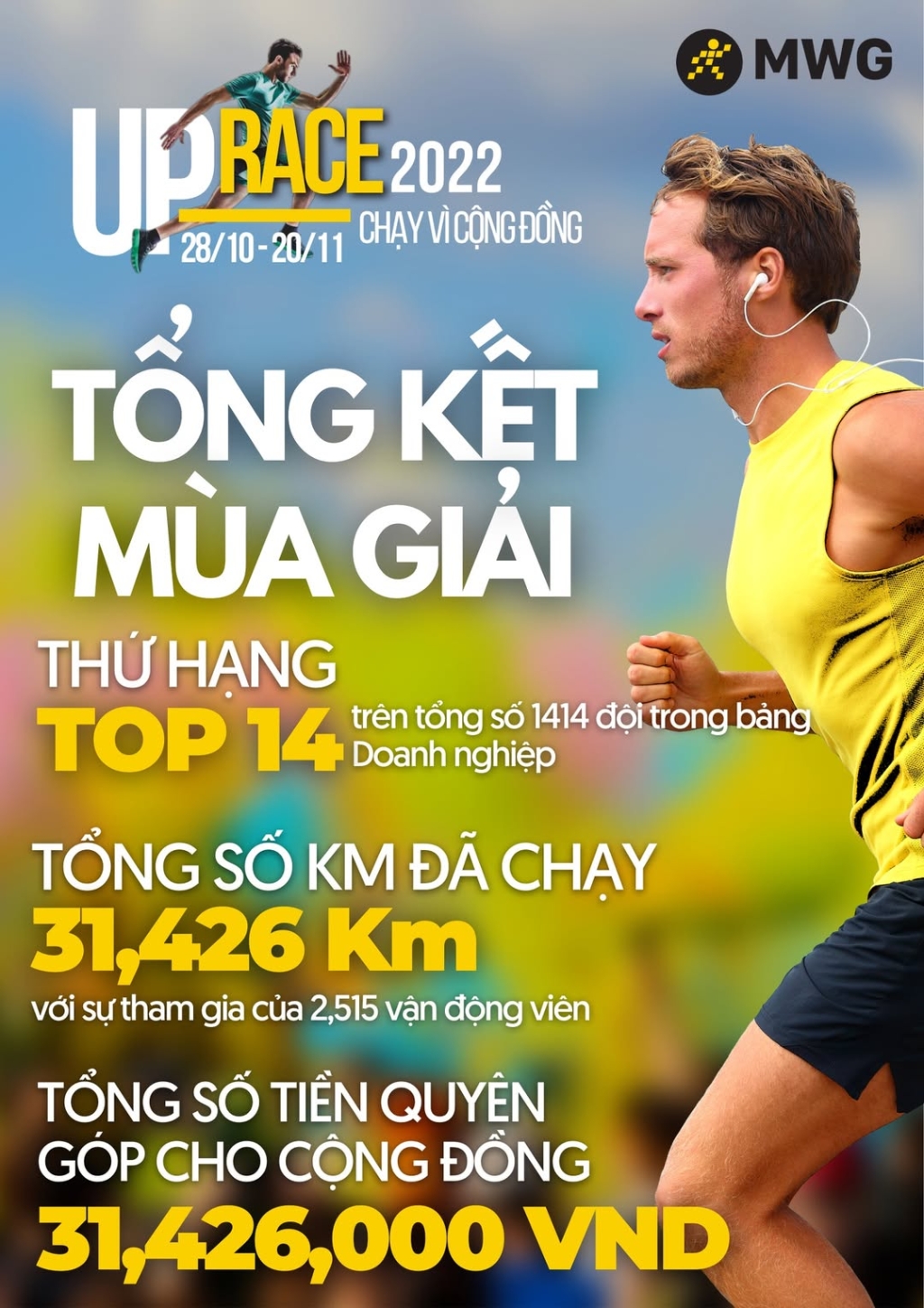 Với sự góp mặt của 2.515 vận động viên và 31.426 km được chinh phục, tập thể MWG đã quyên góp cho cộng đồng với tổng số tiền là 31.426.000 VNĐ. Cùng kết quả này, MWG được ghi nhận xếp thứ 14 trên tổng số 1.414 doanh nghiệp tham gia giải chạy. MWG đã lan toả được tinh thần “chạy vì cộng đồng” khi việc chạy không đơn thuần là rèn luyện sức khỏe, mỗi km đều mang theo thông điệp sẻ chia và trách nhiệm xã hội.