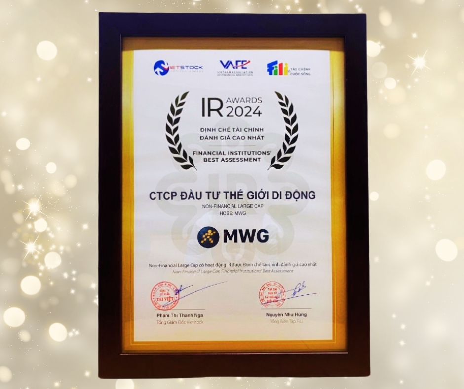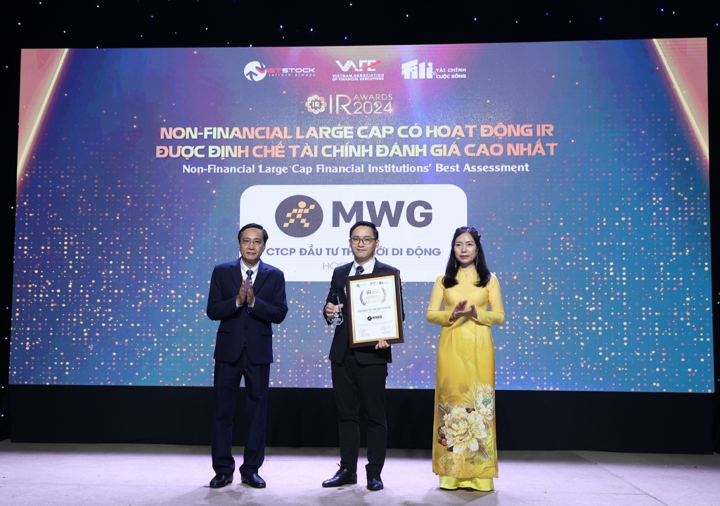 On September 24, 2024, at the 14th IR Awards Ceremony, Mobile World Investment Corporation (HOSE: MWG) was proudly named in the Top 3 Large-Cap Companies with the most investor-favored Investor Relations (IR) activities in the Non-Financial Large Cap Financial Institutions’ Best Assessment. This award is a testament to the company’s unwavering commitment to maintaining and fostering transparent and effective investor relationships.