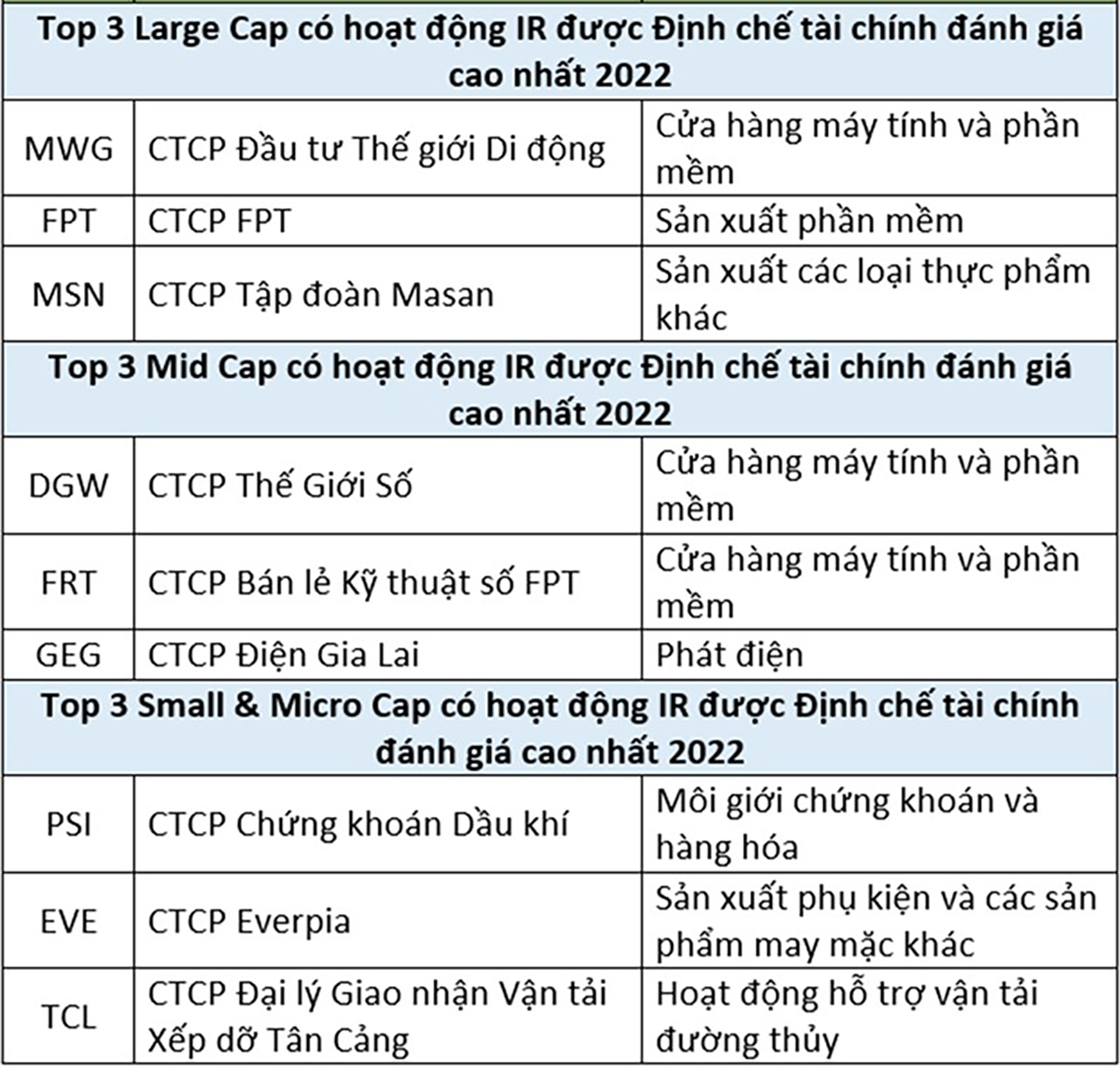 In the Top 3 Large Cap category with IR activitiesmost recognized by Financial Institutions in 2022, Mobile World InvestmentCorporation (MWG) was honoured to be named, along with FPT Corporationand Masan Group.