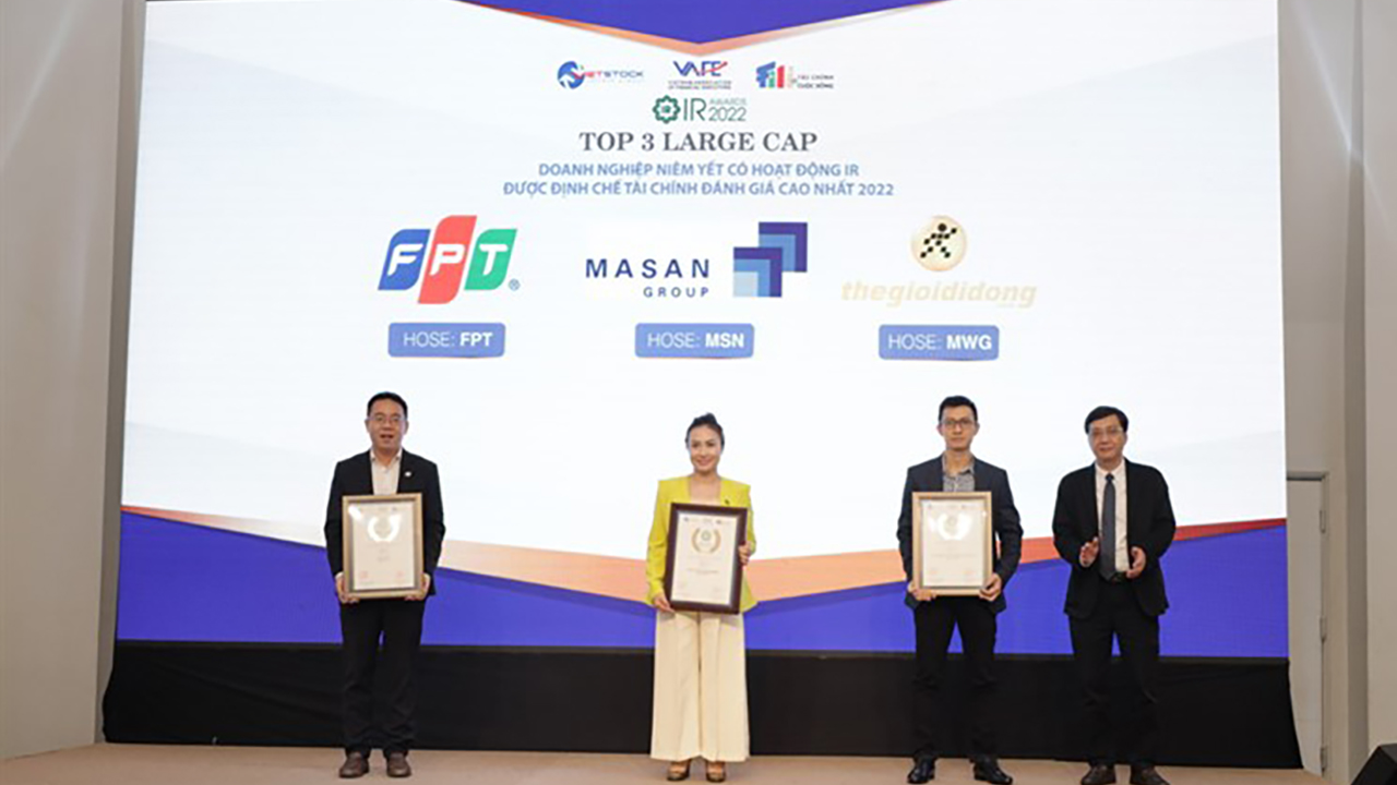 The Ceremony of Honoring Listed Companies with BestIR Performances 2022 (IR Awards) was organized by VAFE, FiLi and Vietstock toname and honour those with the best IR activities. Mobile World InvestmentCorporation (MWG) was honoured to be named in the Top 3 Large Cap with IRactivities most appreciated by financial institutions in 2022.