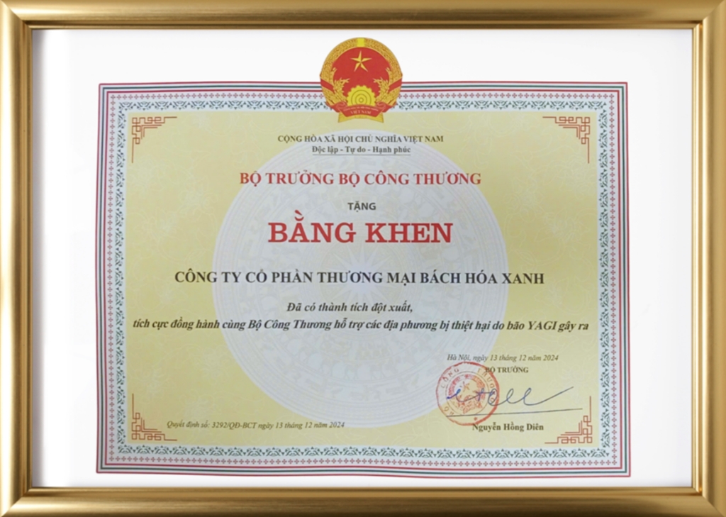 In a concerted effort to support localities heavily affected by Typhoon Yagi, on January 7, 2025, Mobile World Investment Corporation (MWG) – Bach Hoa Xanh Trading JSC was awarded a Certificate of Merit by the Minister of Industry and Trade. This recognition underscores the company's timely and significant contributions to assisting communities impacted by the storm.