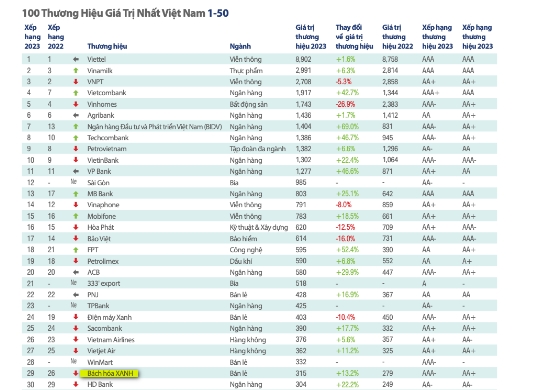 Simultaneously, according to Brand Finance's ranking of the 100 most valuable brands in Vietnam for 2023, Điện Máy Xanh, Bách Hóa Xanh, and Thế Giới Di Động are positioned at 24th, 29th, and 32nd places respectively. The brand value of Điện Máy Xanh is 403 million USD, making it the most valuable brand within Mobile World Corporation's (MWG) portfolio. Following that is Bách Hóa Xanh, with a value of 315 million USD, and thegioididong.com, with 256 million USD.