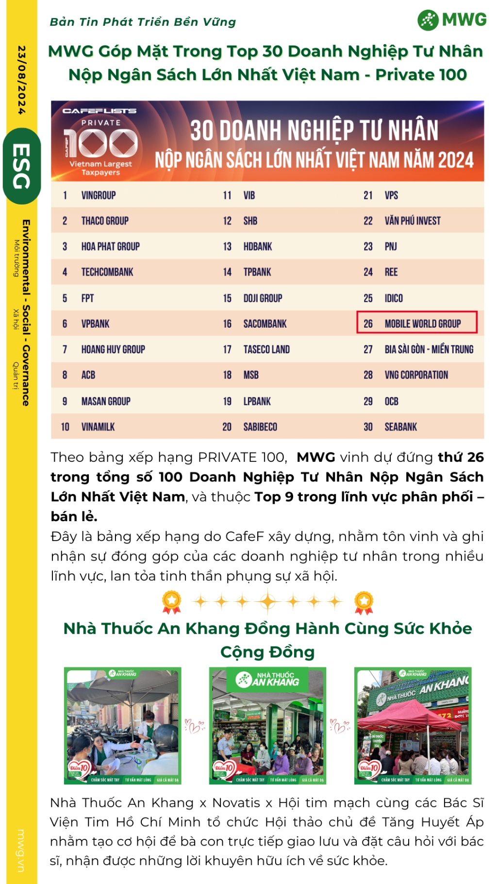 MWG Góp Mặt Trong Top 30 Doanh Nghiệp Tư Nhân Nộp Ngân Sách Lớn Nhất Việt Nam - Private100