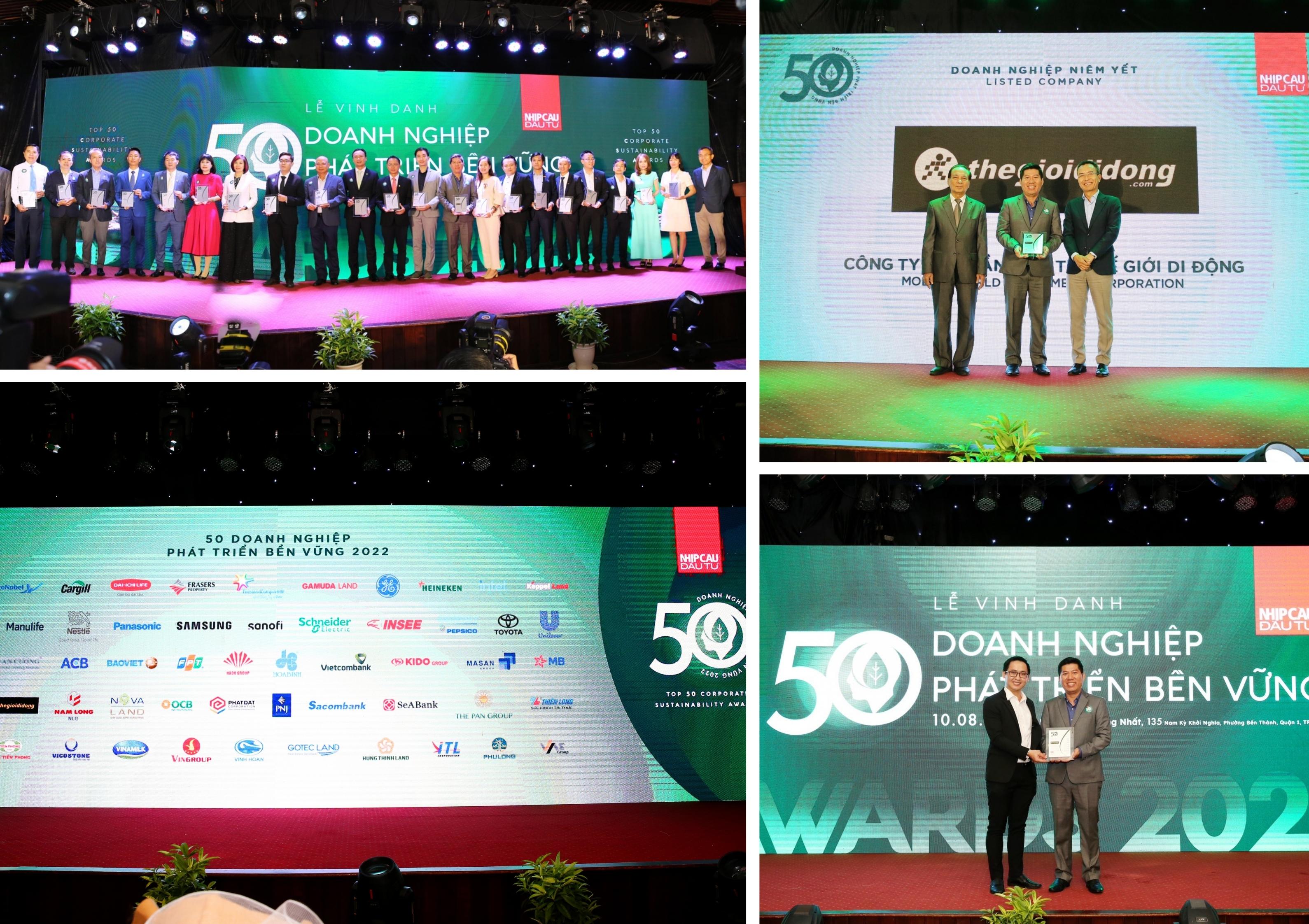 Ngày 10/08/2022, MWG vinh dự được vinh danh trong ‘Top 50 Doanh nghiệp phát triển bền vững 2022’ tại chương trình Bình chọn Doanh nghiệp phát triển bền vững 2022 (Corporate Sustainability Awards) .