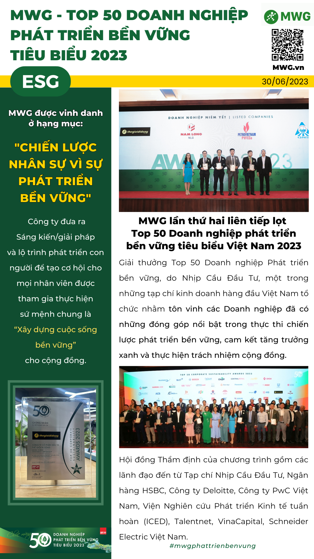 MWG lần thứ hai liên tiếp lọt Top 50 Doanh nghiệp phát triển bền vững tiêu biểu Việt Nam 2023
