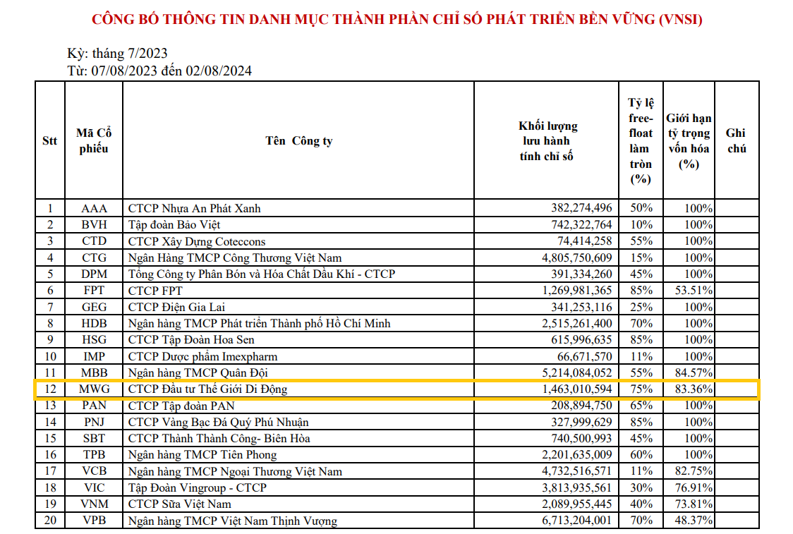 Vào ngày 17/07/2023, Sở Giao dịch Chứng khoán Thành phố Hồ Chí Minh (HOSE) đã chính thức công bố danh mục cổ phiếu thành phần của chỉ số Phát triển bền vững VNSI (Vietnam Sustainability Index), trong đó, MWG lần đầu tiên vinh dự được xếp vào top 20 cổ phiếu có chỉ số phát triển bền vững tốt nhất thị trường. Đánh giá này được thực hiện toàn diện dựa trên ba khía cạnh quan trọng là Môi trường (E), Xã hội (S) và Quản trị (G).
