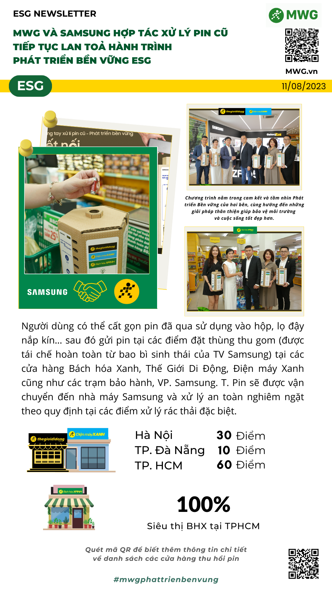 MWG VÀ SAMSUNG HỢP TÁC XỬ LÝ PIN CŨ TIẾP TỤC LAN TOẢ HÀNH TRÌNH PHÁT TRIỂN BỀN VỮNG ESG