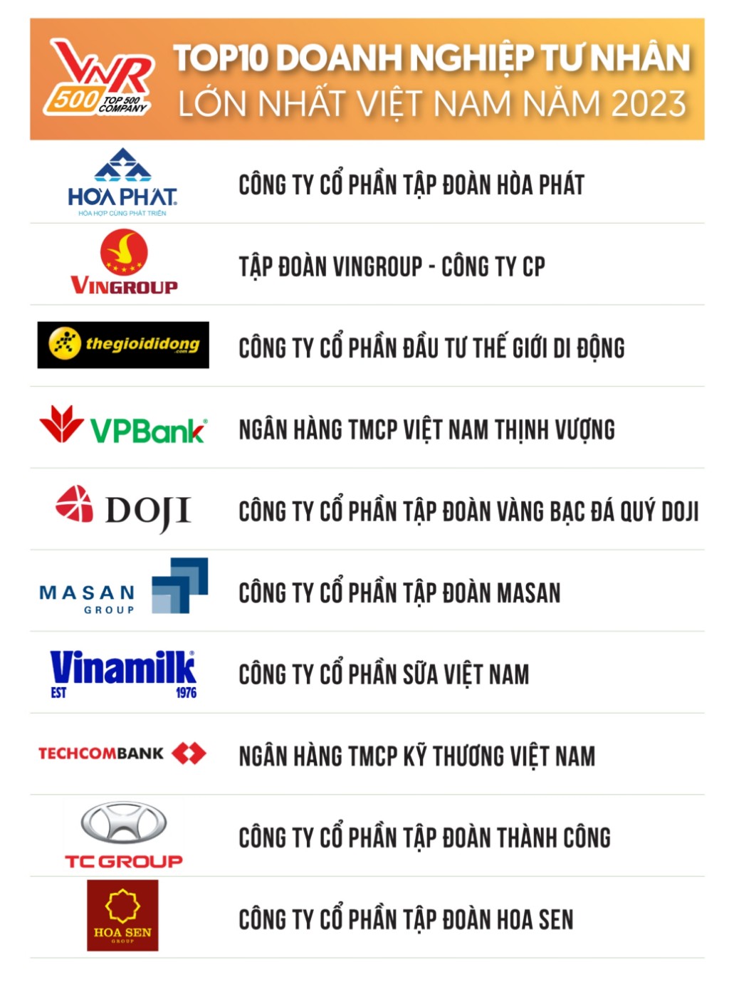Ngày 17/11/2023, Vietnam Report đã công bố Bảng xếp hạng VNR500 - Top 500 Doanh nghiệp tư nhân lớn nhất Việt Nam năm 2023. Trong đó, những vị trí đứng đầu không có nhiều xáo trộn, Công ty Cổ phần Tập đoàn Hòa Phát tiếp tục giữ vững vị trí số 1 vượt qua cả Tập đoàn Vingroup trong bảng xếp hạng này.