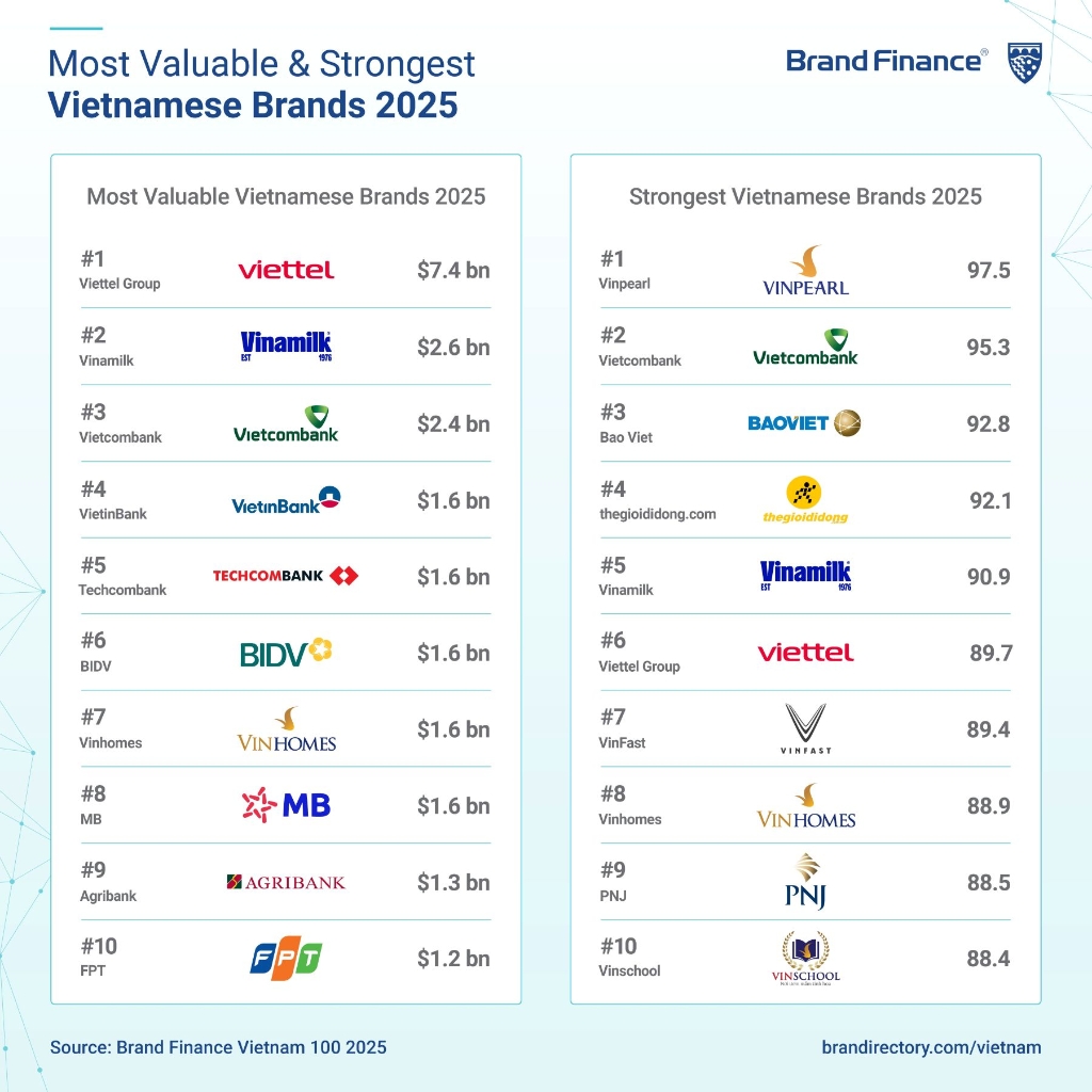 Đây là bảng xếp hạng uy tín do Brand Finance – công ty tư vấn và định giá thương hiệu hàng đầu thế giới có trụ sở tại London – thực hiện hằng năm, dựa trên khảo sát khoảng 6.000 thương hiệu toàn cầu và công bố hơn 100 báo cáo theo ngành nghề và quốc gia. Trong báo cáo Vietnam 100 2025, Brand Finance cho biết tổng giá trị 100 thương hiệu hàng đầu Việt Nam đạt 38,4 tỷ USD, giảm 14% so với năm trước do những thách thức kinh tế