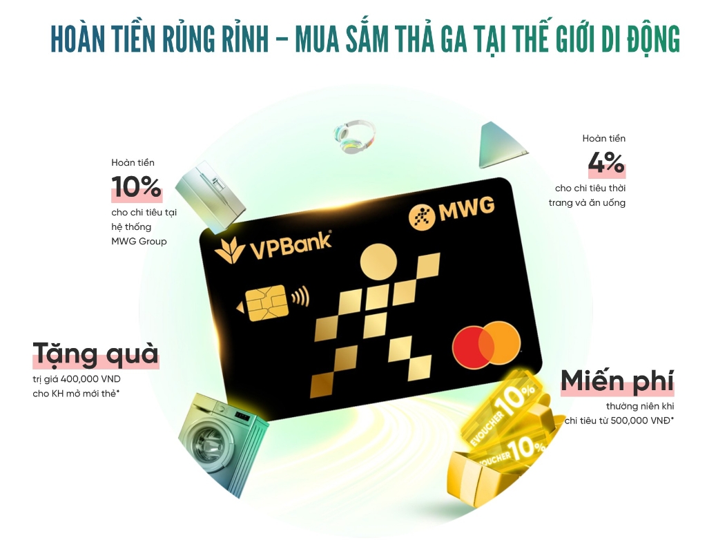 Theo đó, chủ thẻ VPBank MWG Mastercard được hưởng chính sách hoàn tiền cho mọi giao dịch chi tiêu. Cụ thể, mức hoàn tiền 10% áp dụng cho các giao dịch tại hệ sinh thái DMX, gồm Thế Giới Di Động, Điện Máy Xanh, TopZone, Avakids và Nhà thuốc An Khang, với hạn mức tối đa 300.000 đồng mỗi kỳ sao kê. Các giao dịch chi tiêu cho thời trang và ăn uống được hoàn tiền 4%, tối đa 300.000 đồng mỗi kỳ sao kê; các chi tiêu khác được hoàn tiền 0,1% không giới hạn khi đáp ứng điều kiện doanh số theo thể lệ.